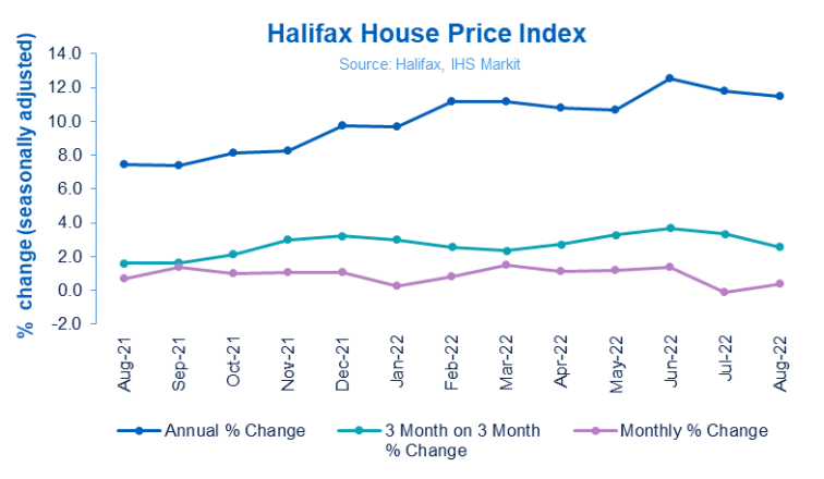 Halifax published their house price index for August this week, revealing that – despite a 0.4% increase in property values in the month – the annual rate of growth eased to 11.5% from 11.8%.