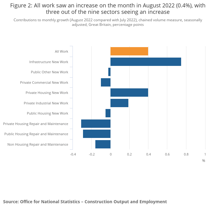 In better news, latest data from the Office for National Statistics (ONS) has found that construction enjoyed a modest 0.4% growth in output during August.