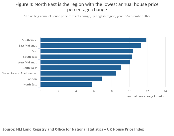 London was replaced by the North East as the lowest-performing region, with prices increasing by just 5.8% over the year.