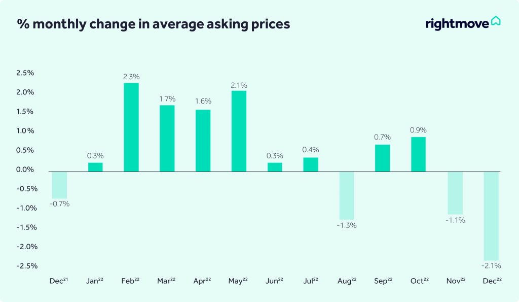 The monthly fall – which Rightmove describe as “a bigger dip than usual at this time of year” means that 2022 ends with property values at 5.6% higher than this time last year. In 2021, annual growth was 6.3%.