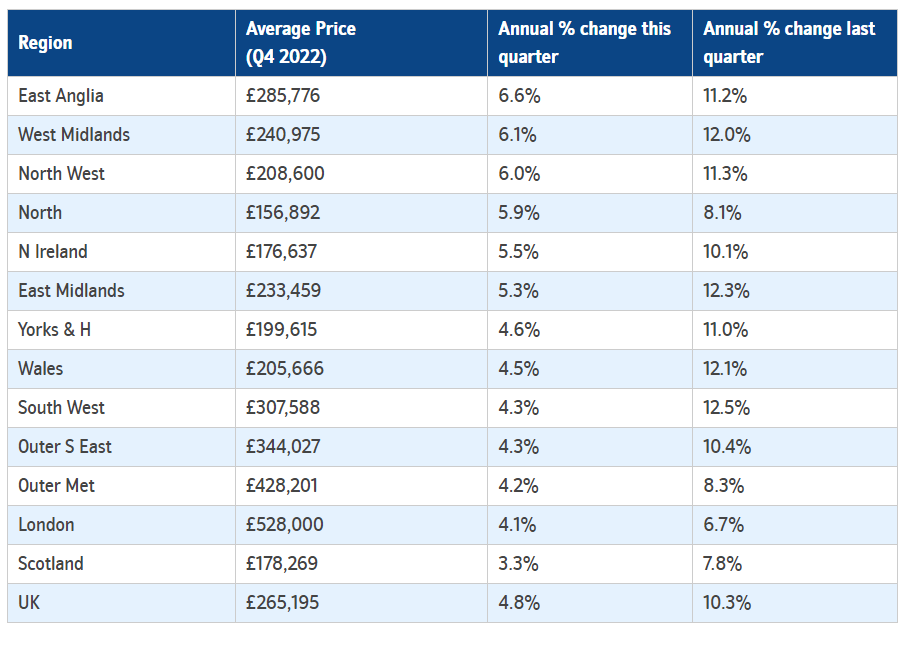 House price growth slowed in all UK regions, which experienced steep falls in the last quarter of the year.
