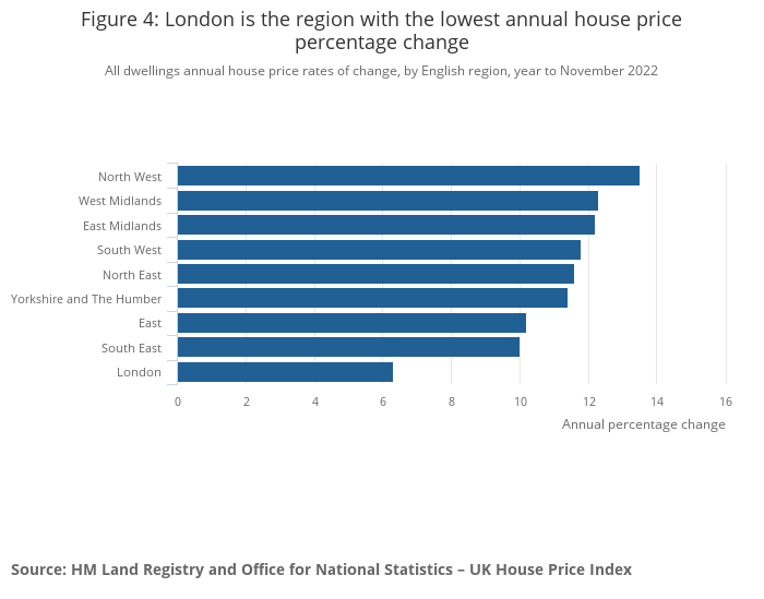 The North West experienced the largest annual regional growth, at 13.5%. London posted the lowest increase, at 6.3%.