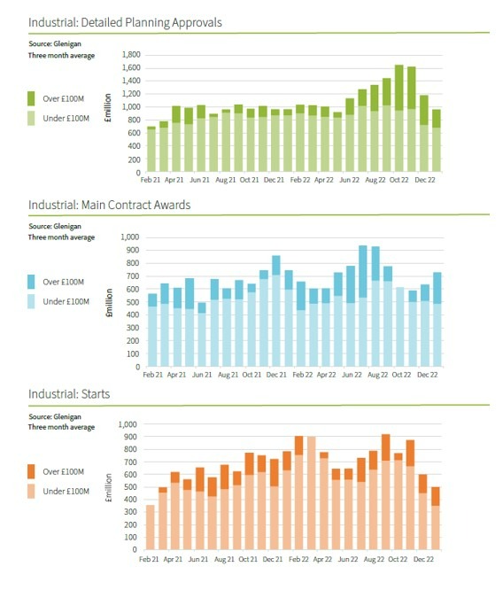 Construction data analyst Glenigan has reported a fall in construction starts and detailed planning approvals in the three months to January.