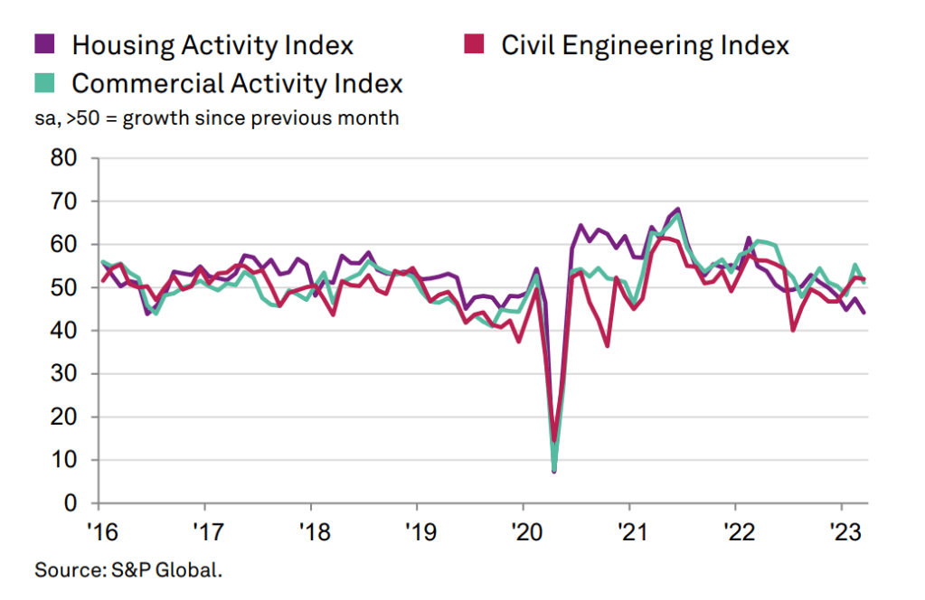 Whilst overall construction output remained over 50.0, which indicates an increase in output, housebuilding was the weakest performing segment for the fourth month in a row, and the fastest rate of decline since May 2020.