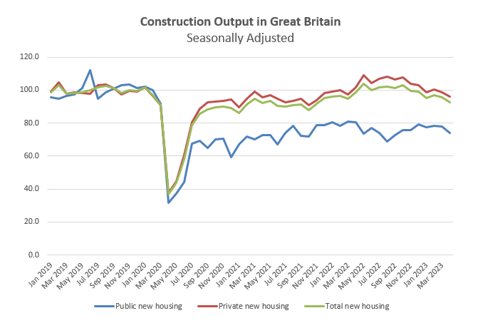 Latest official figures from the Office for National Statistics (ONS) have revealed that construction output is estimated to have decreased by -0.6% in April 2023, with a 3% fall in private housebuilding being one of the main contributors.