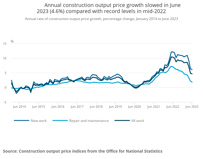 Official figures from the Office for National Statistics (ONS) have revealed that the annual rate of construction inflation was 4.6% in the year to June 2023.