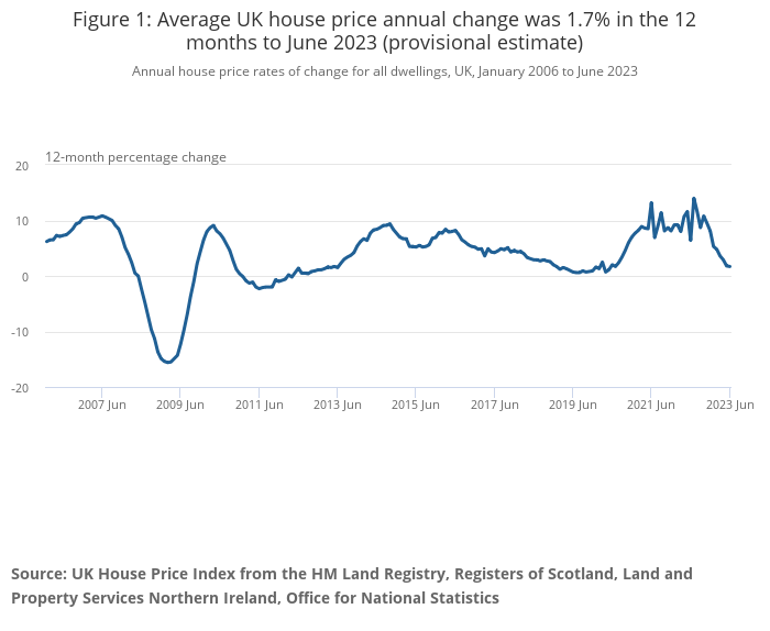 The Office for National Statistics has published its house price index for June 2023, revealing a slight slowing in annual house price inflation to 1.7% (May: 1.8%).