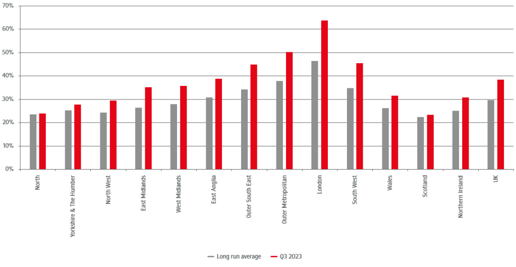 Despite the fall in average prices, home ownership continues to remain unaffordable, with the typical first-time buyer with a 20% deposit spending 38% of their take home pay on their monthly mortgage payment – well above the long-run average of 29%.