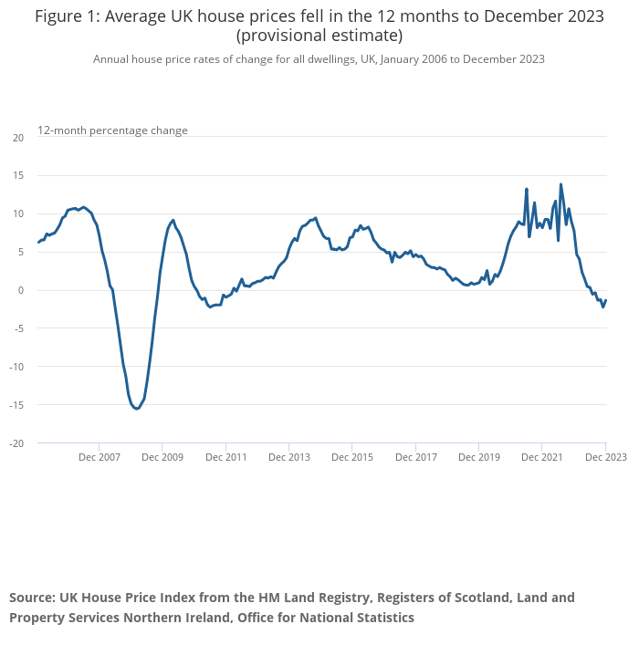 Official figures from the Office for National Statistics (ONS) have revealed that the average UK property price fell by -1.4% over the year to December 2023 to £285,000.