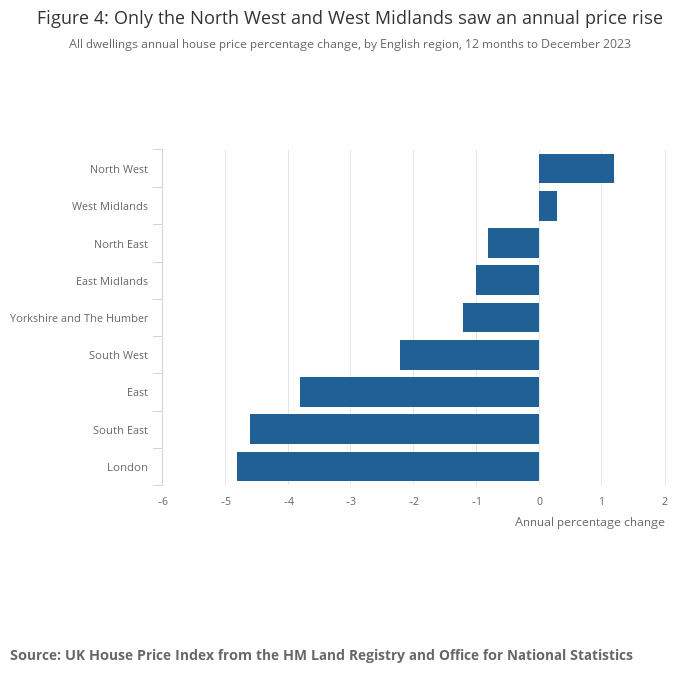 In England, only the North West and West Midlands regions saw an annual increase in house prices. London was the worst performing region, where prices fell over the year by -4.8%.