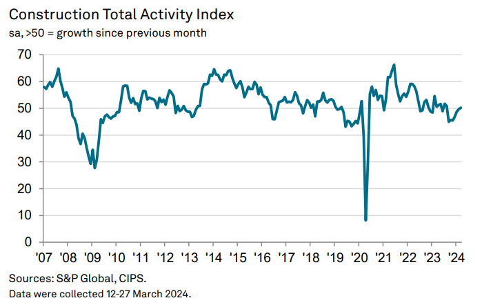 The latest Purchasing Managers’ Index from S&P Global / CIPS UK has revealed that construction output returned to growth in March after six months of decline.