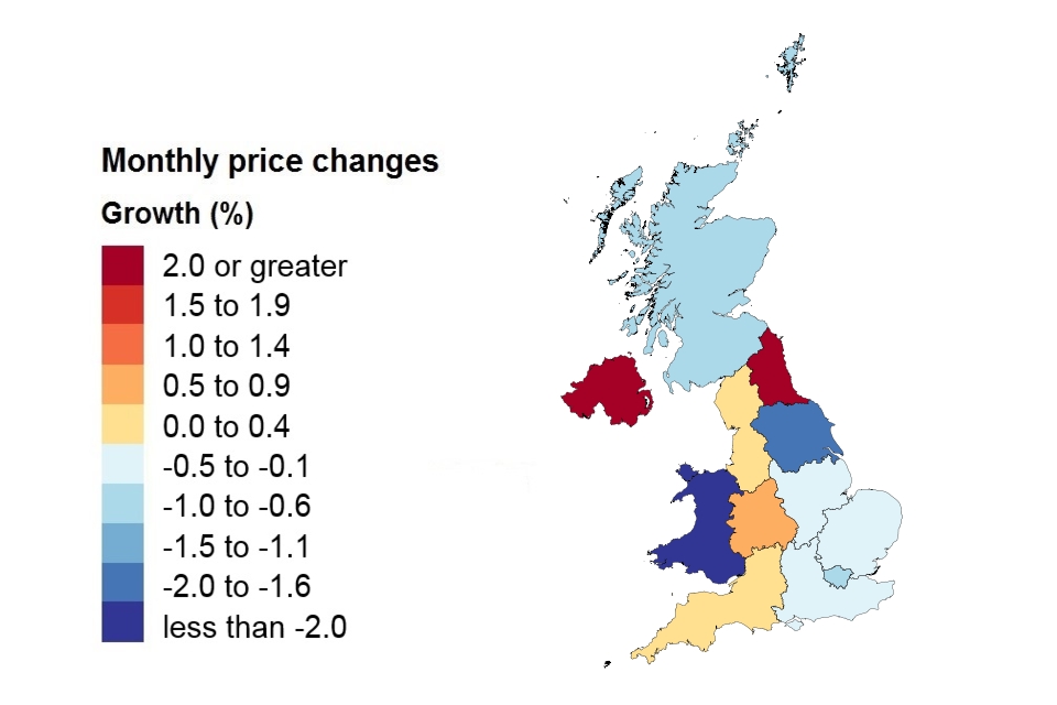The annual rate of growth was highest in the North East, at 6.5%. London experienced a fall in house prices over the year, at -0.5%.