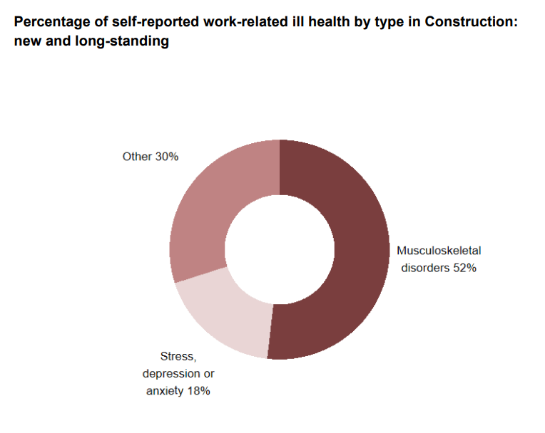 Over half of those suffering from ill health have musculoskeletal disorders, with 18% suffering from stress, depression or anxiety – a condition prevalent within the industry, with two construction workers taking their own life every day.