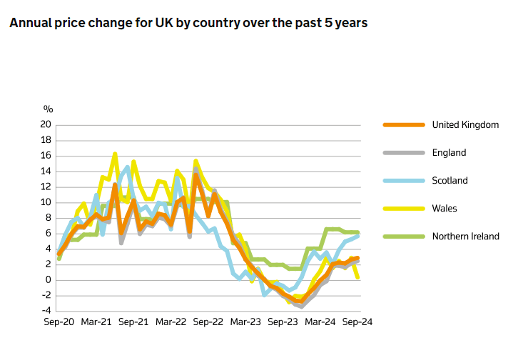 Latest data from the Office for National Statistics has revealed a 2.9% increase in property prices over the twelve months to September.