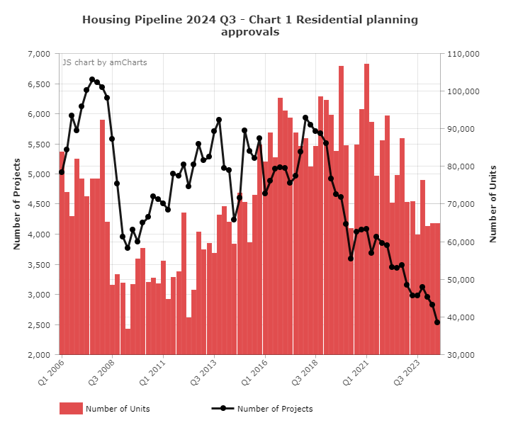 The latest Housing Pipeline Report from the Home Builders Federation (HBF) for Q3 2024 has revealed that planning approvals for both sites and units have continued their downward trend.