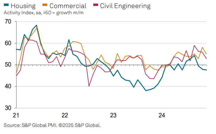 Residential work registered an overall decline in output during December, at 47.6. Housing activity has now decreased for three consecutive months, and the latest reduction was the fastest since June 2024.