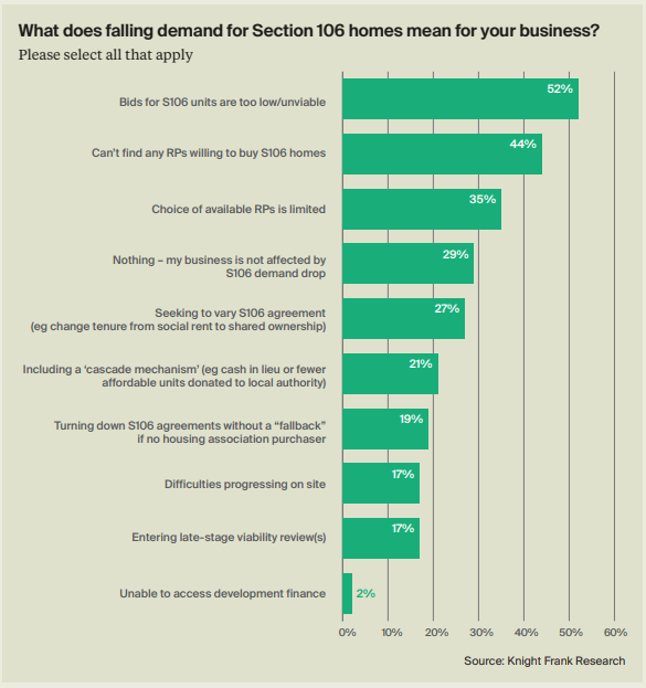 The most recent Residential Development Land Index report by real estate agency Knight Frank has placed renewed emphasis on the housing industry’s struggle to find registered providers willing to bid on Section 106 homes.