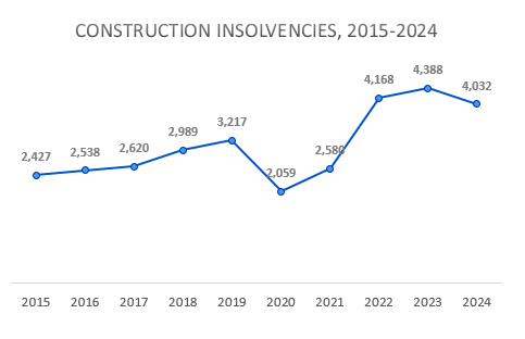 However, the number of construction insolvencies in 2024 is still 25% higher than the 3,217 registered in 2019.