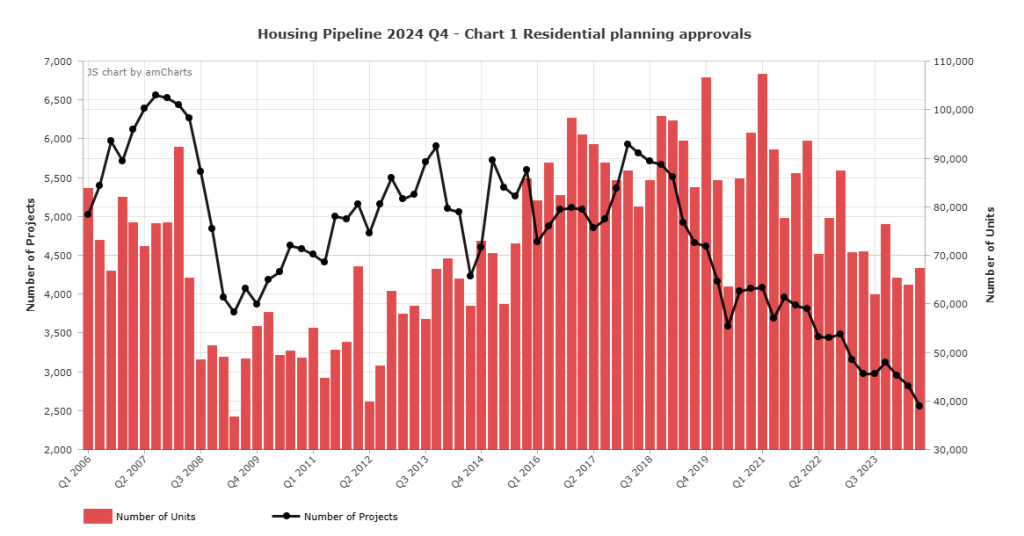 The Home Builders Federation (HBF) has published its Housing Pipeline Report for the final quarter of 2024, revealing that last year saw planning approvals hit a decade low.