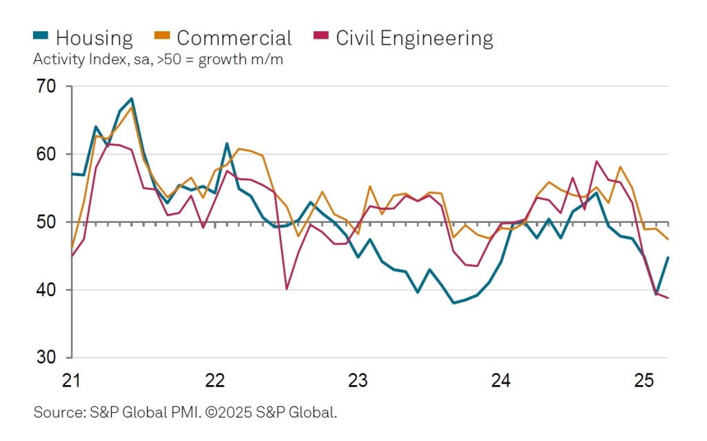 Residential building activity improved from 39.3 in February to 44.7 in March, with survey respondents suggesting that easing borrowing costs are helping to support confidence.