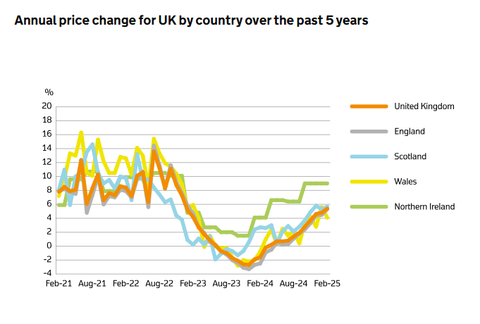 The Office for National Statistics has published its latest house price index, revealing an increase in annual house price inflation from 4.8% in January to 5.4% in February.