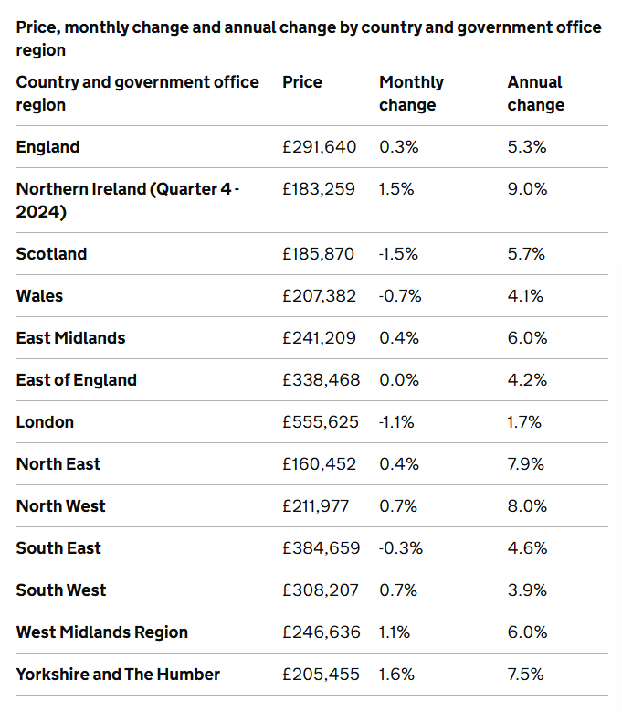 Average house prices in the year to February increased in England to £292,000 (5.3%), increased in Wales to £207,000 (4.1%) and increased in Scotland to £186,000 (5.7%). The average house price increased in the year to Q4 (Oct to Dec) 2024 to £183,000 in Northern Ireland (9.0%).