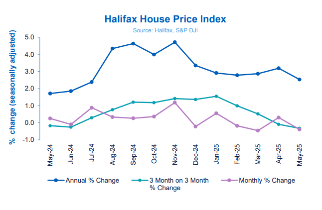 The Halifax house price index for May has found that the average property value fell by -0.4% in the month, with annual rate of growth slowing from 3.2% in April to 2.5%.