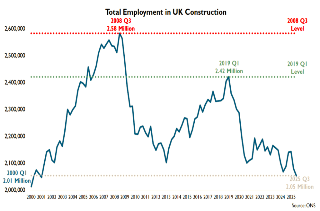Meanwhile, latest Government figures have shown that construction employment has slumped to its lowest level since 2000.