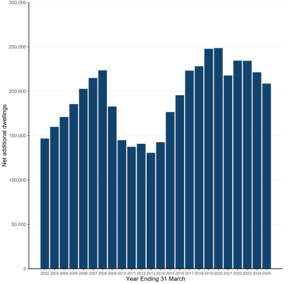 Latest Government statistics have revealed that there was a total of 208,600 net additional dwellings in 2024/25 – a -6% decrease on 2023/24.