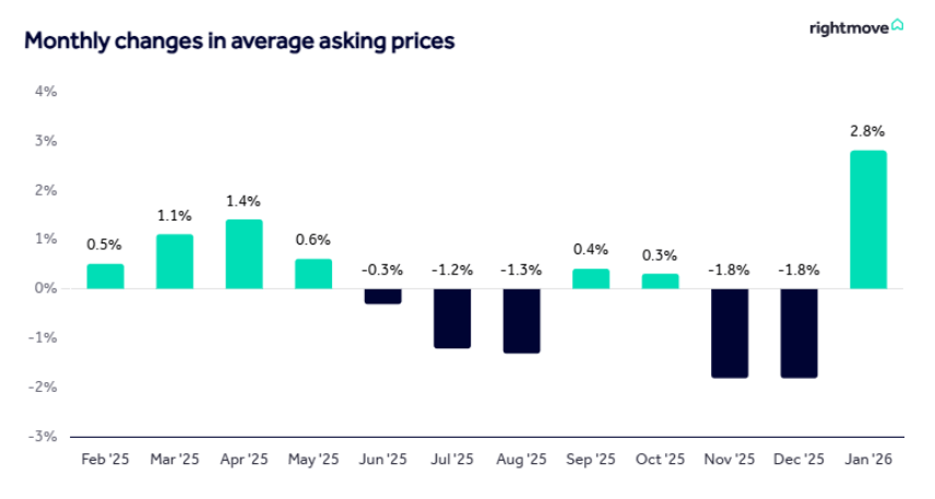 The latest house price index from Rightmove has found that house prices rose 2.8% in January – the largest increase in any month since June 2015.