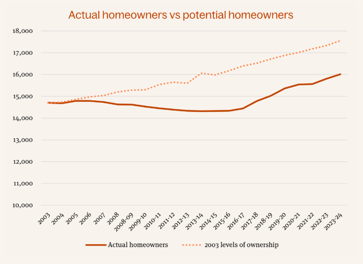 The report found that young people and first-time buyers were the worst affected, and that home ownership in England has fallen to 64.8% of households in 2024 from 71% in 2003.